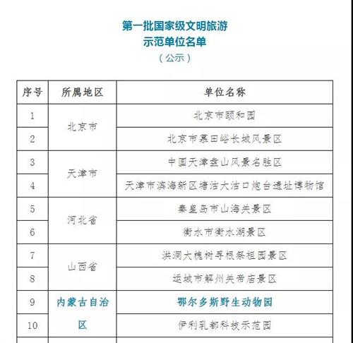 29日,文化和旅游部官网正式公布《全国旅游标准化技术委员会关于第一批国家级文明旅游示范单位的公告》,鄂尔多斯野生动物园成功入选。