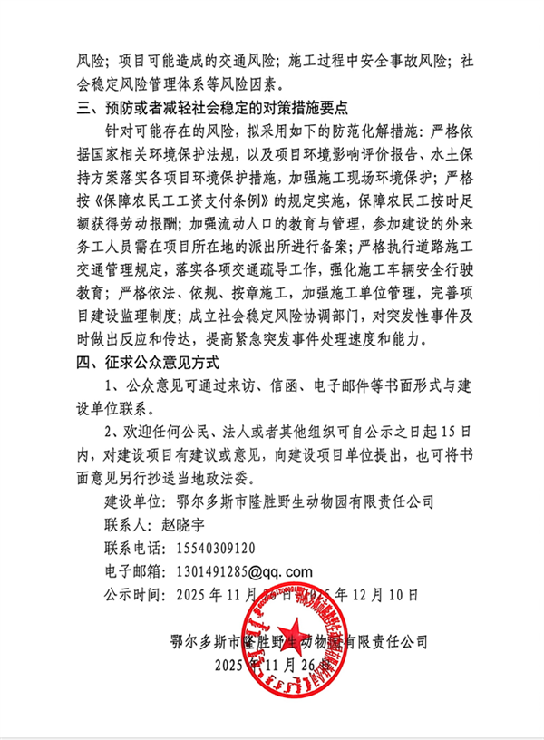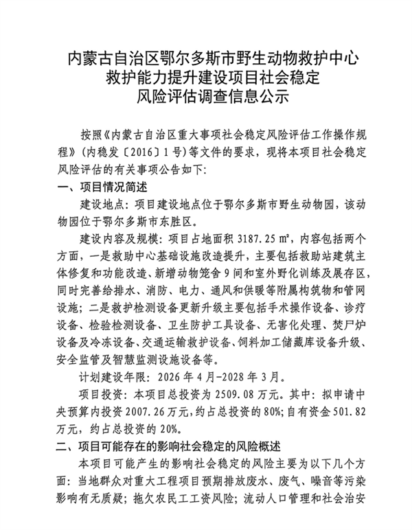 内蒙古自治区鄂尔多斯市野生动物救护中心救护能力提升建设项目社会稳定风险评估调查信息公示